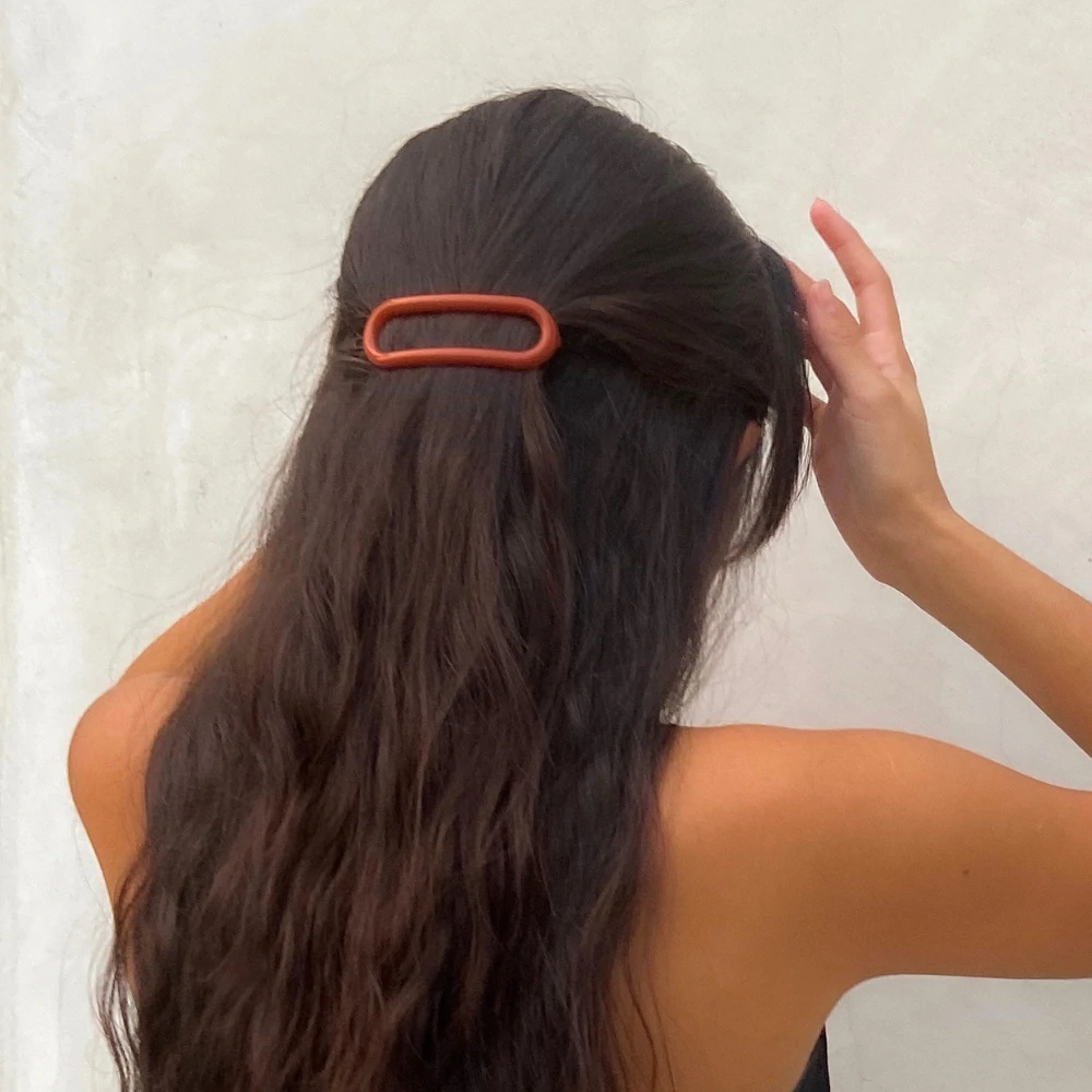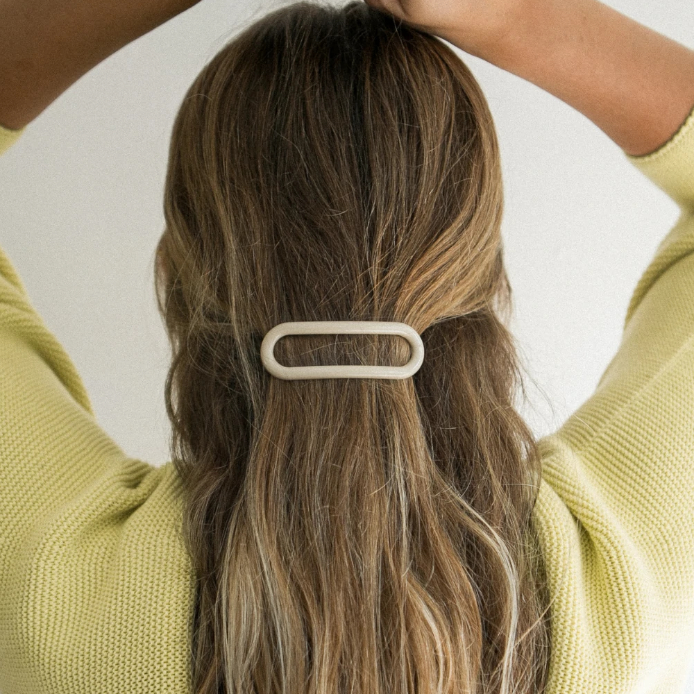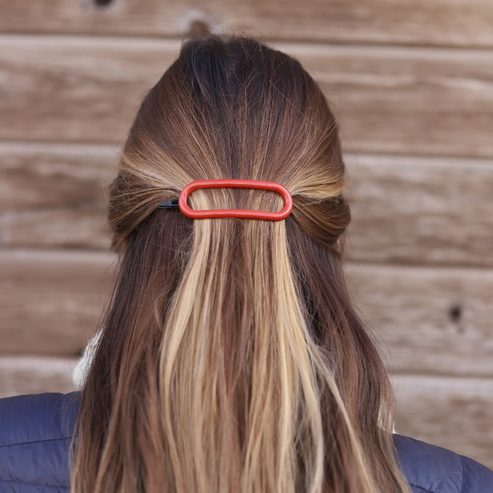 The oval barrette is made from plastic and the rectangle hair clip is made of metal. Dimensions: Oval Barrette - 3”x1” Rectangle Clip - 3.2”x 0.3”
