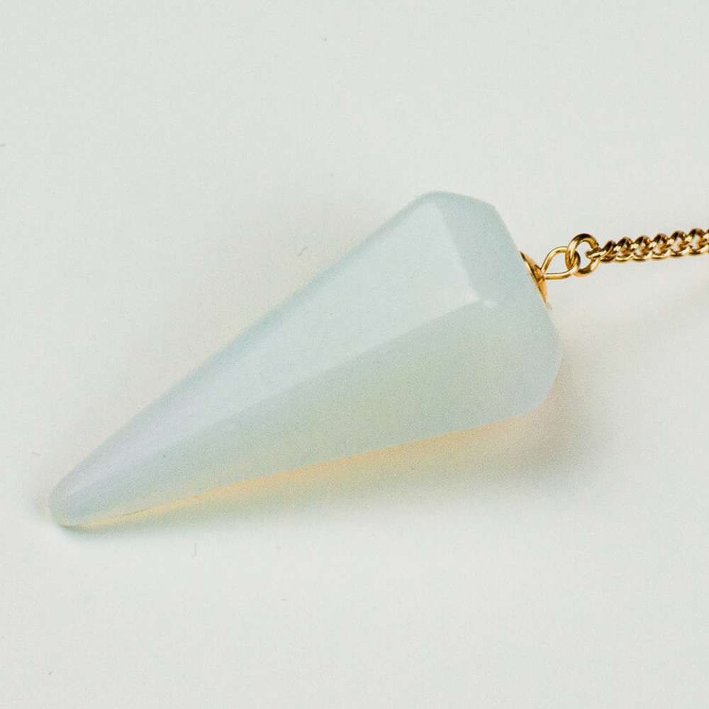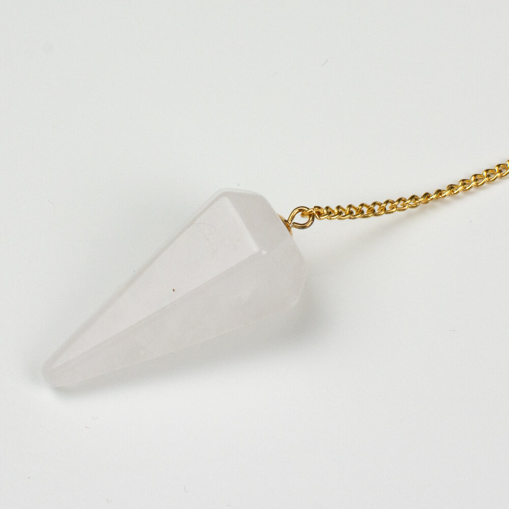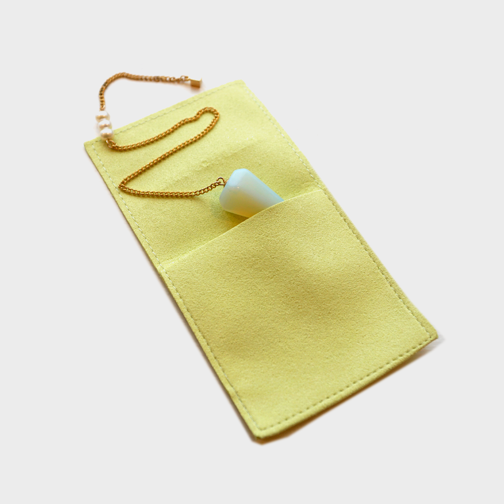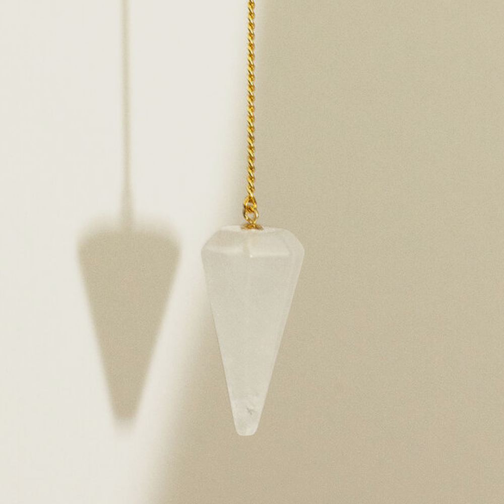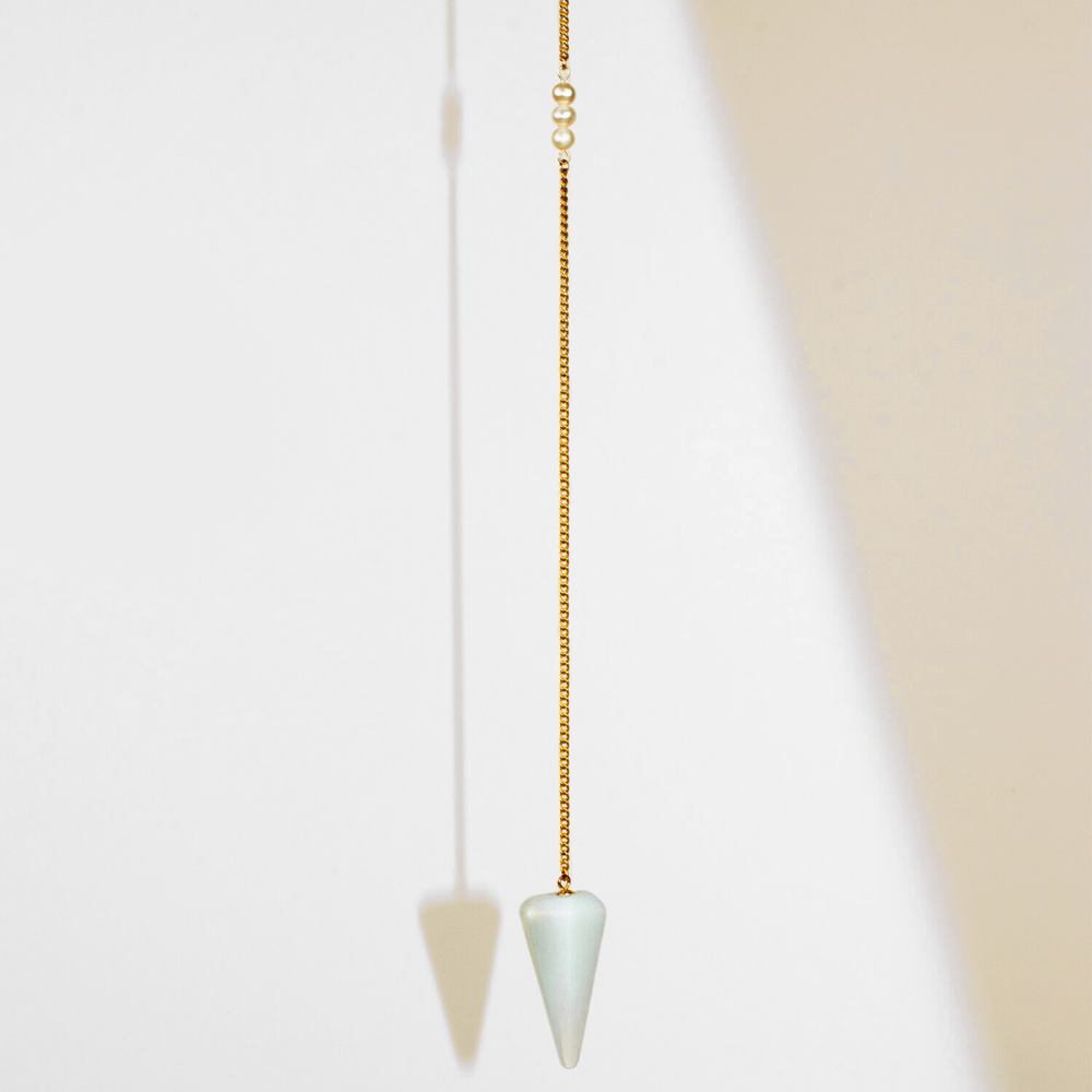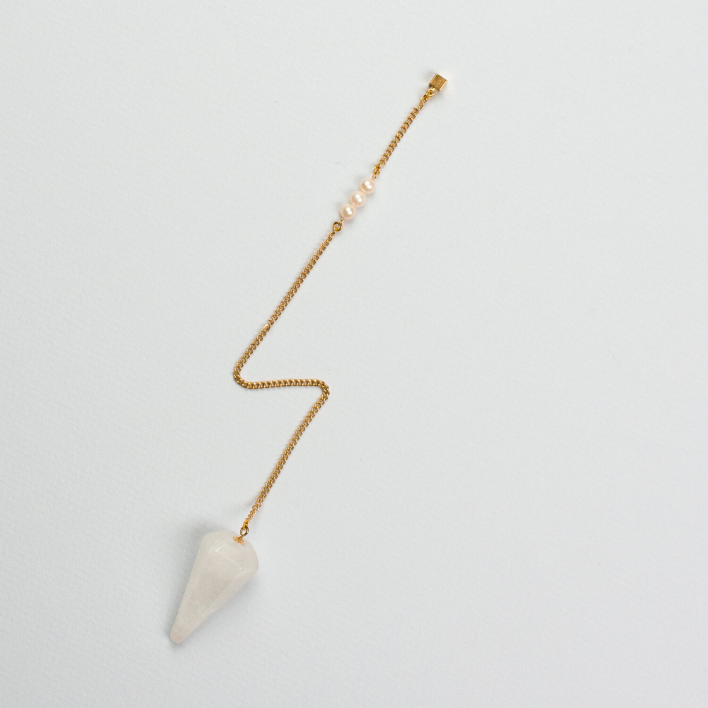 This unique pendulum with a gold-colored brass chain features real freshwater pearls and a minimalist cube on one end. It enhances intuition and stabilizes emotions. Each pendulum comes with a carrying pouch.